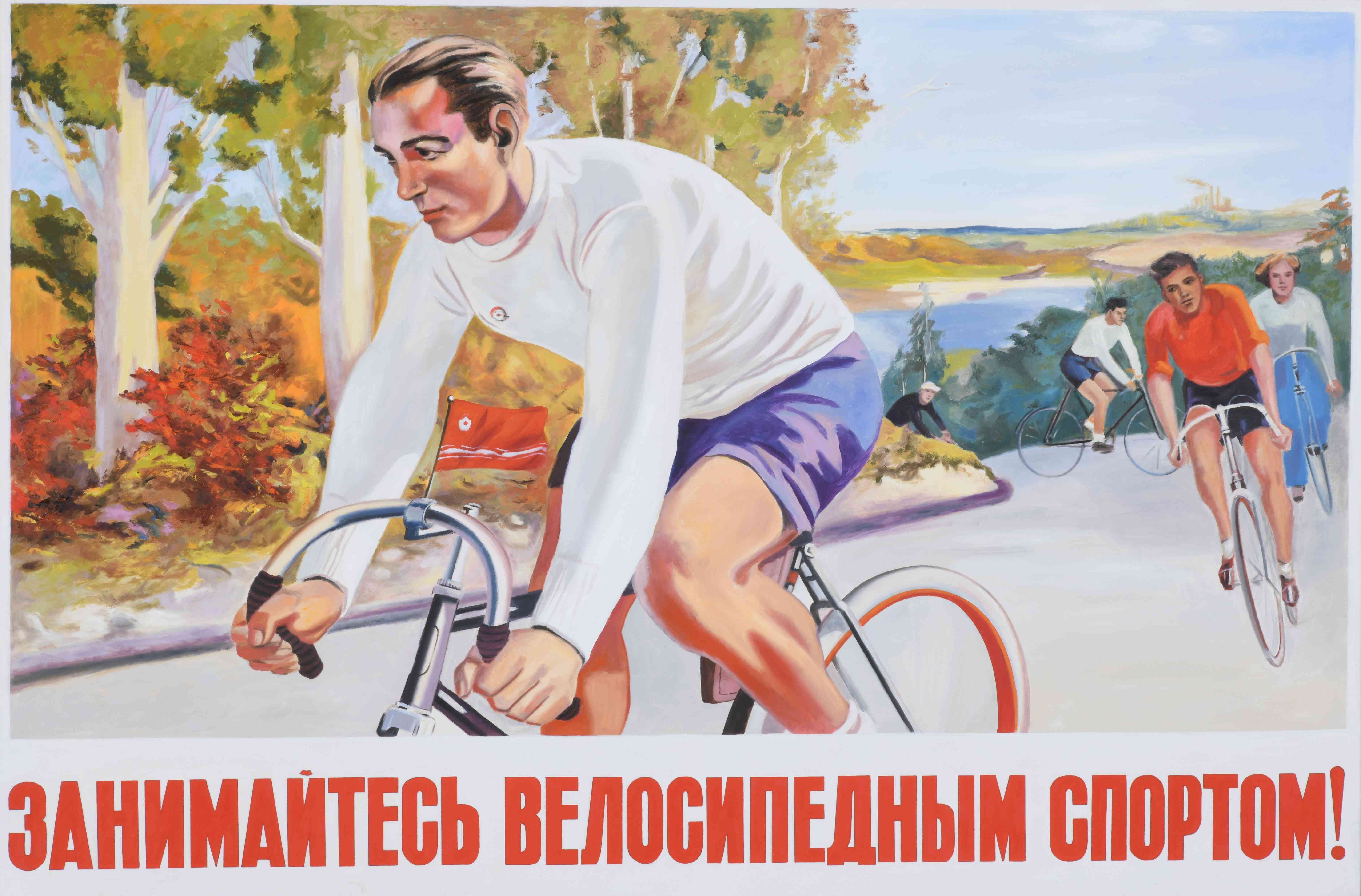Картина является копией советского плаката "Занимайтесь велосипедным спортом". Автором оригинального плаката является Кокорекин Алексей Алексеевич - Советский художник-график, иллюстратор, живописец, выдающийся плакатист Член Союза художников СССР. Заслуженный деятель искусств РСФСР (1956). Лауреат двух Сталинских премий (1946, 1949). Известен главным образом, как автор многочисленных агитационных плакатов на различные темы. Лучшие работы Кокорекина, несомненно, входят в золотой фонд советского агитационно-пропагандистского искусства.