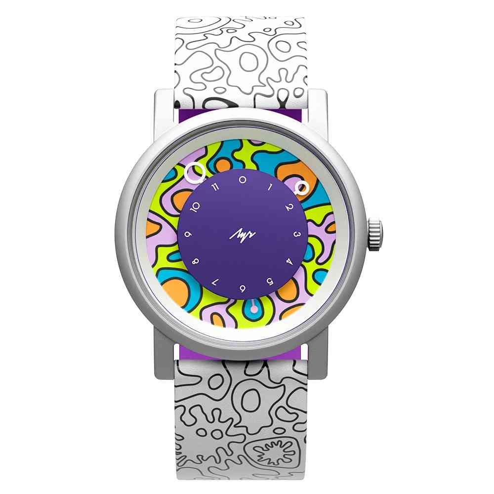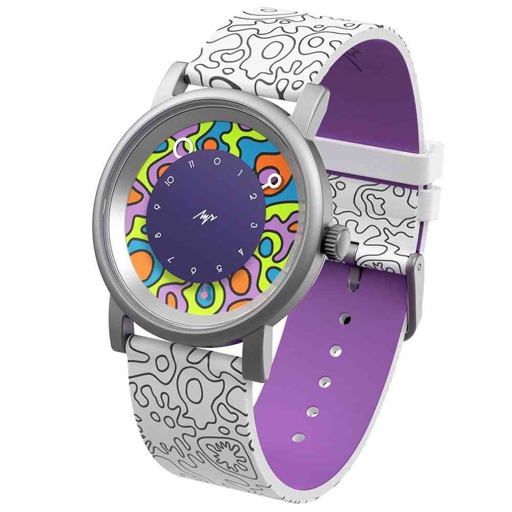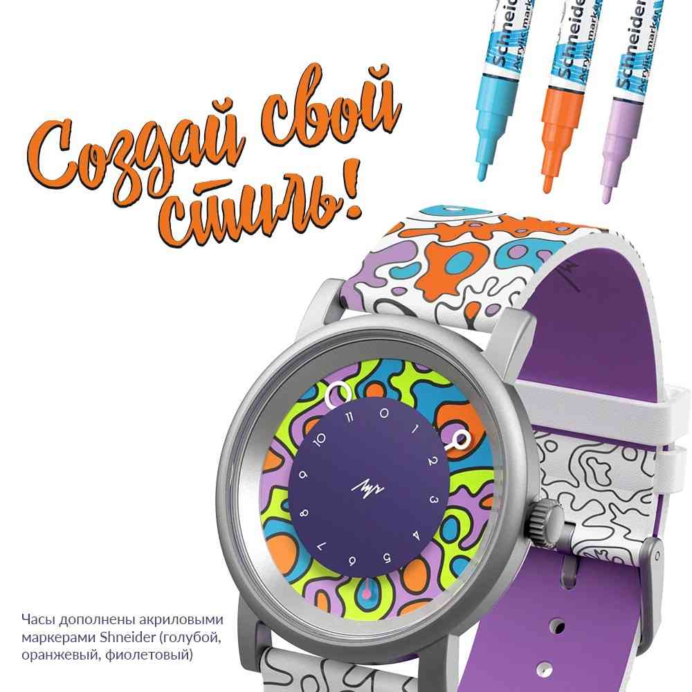 Особенными эти часы еще делает то, что паттерн на них буквально нарисован вручную. В комплекте с часами идут акриловые маркеры Shneider (голубой, оранжевый и фиолетовый пастельный), чтобы будущий владелец смог создать свой собственный неповторимый дизайн.