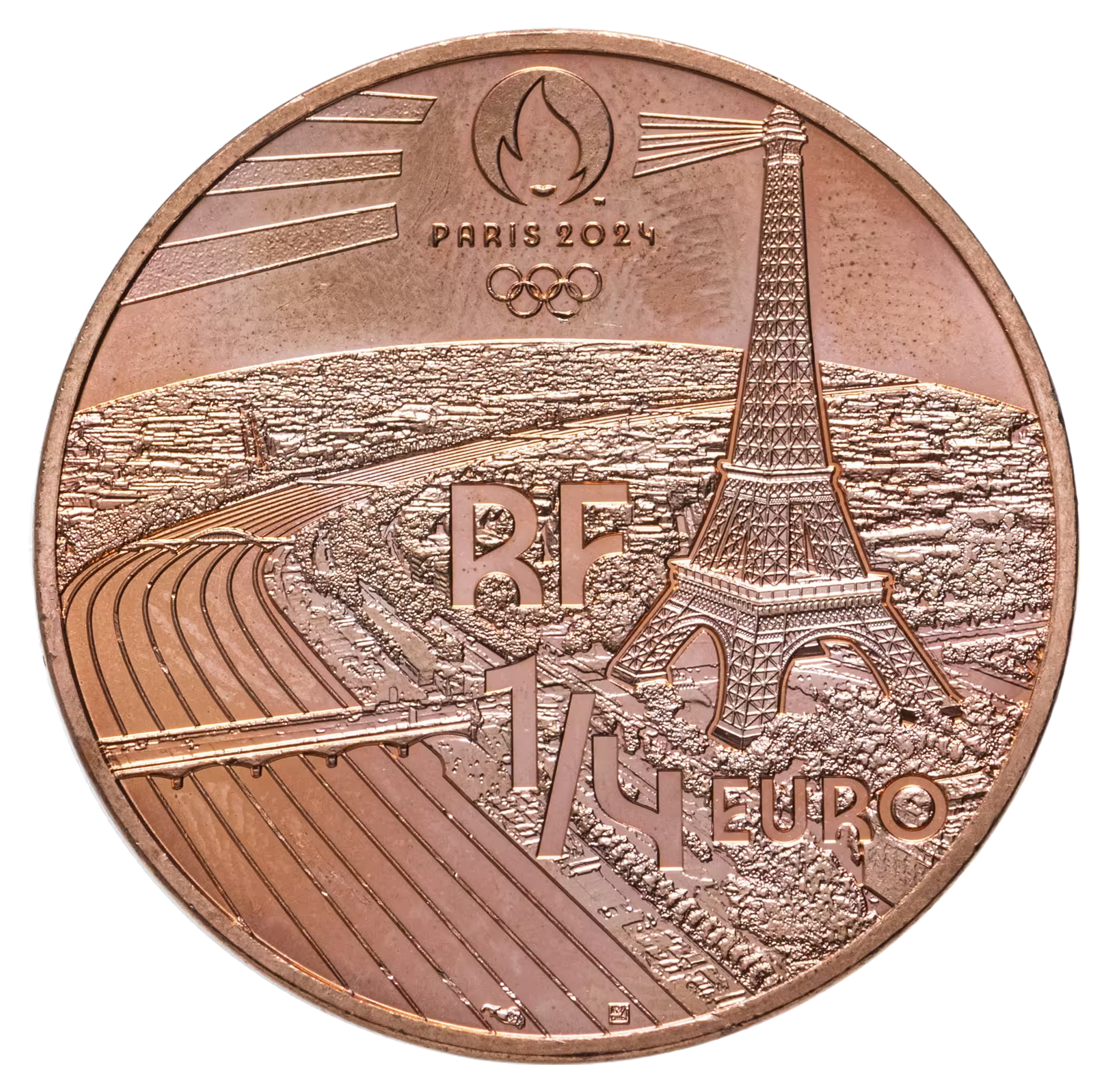 Реверс представляет панорамный вид Парижа с уникальной художественной интерпретацией: изгибы Сены стилизованы под беговую дорожку, а освещённая Эйфелева башня символизирует величие предстоящих Игр. Композицию завершает официальная эмблема PARIS 2024.