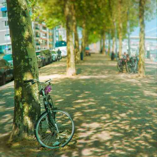 городской бульвар, утопающий в солнечных зайчиках и оставленный велосипед