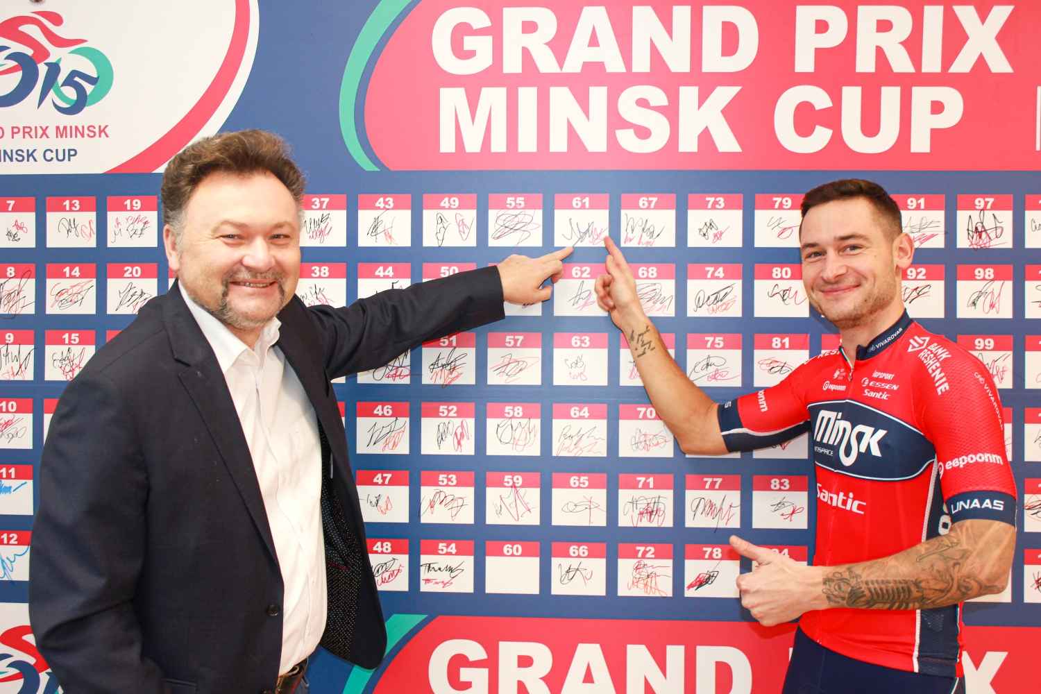 Российский гонщик Роман Майкин после подписания контракта с континентальной командной «Минск» вместе с директором клуба Алексеем Ивановым.