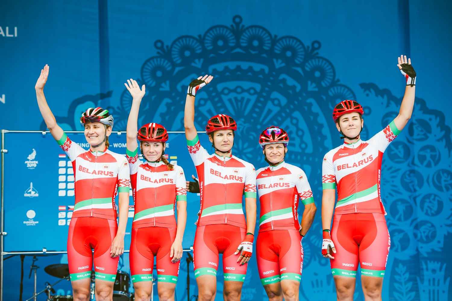 Женская сборная Беларуси на презентации перед стартом групповой гонки, которая принесет стране бронзовую медаль Татьяны Шараковой.