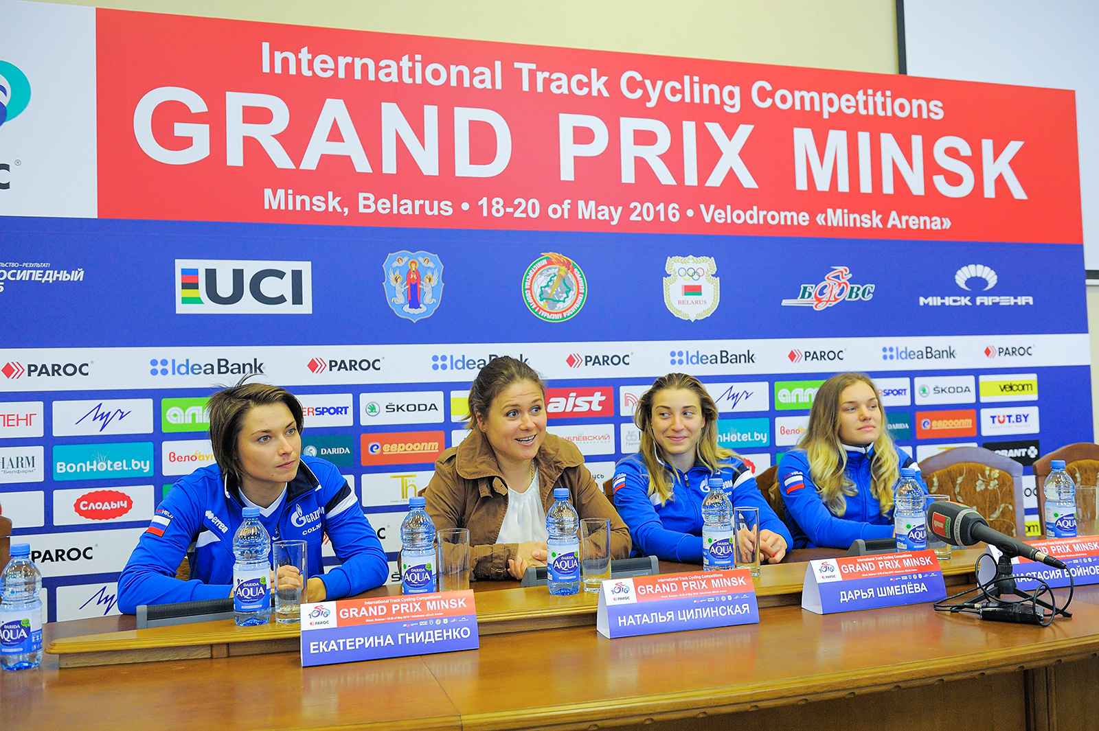 Звезды российского спринта Екатерина Гниденко, Дарья Шмелева и Анастасия Войнова в компании восьмикратной чемпионки мира Натальи Цилинской на пресс-конференции перед стартом международных соревнований на треке «Гран-при Минска-2016».